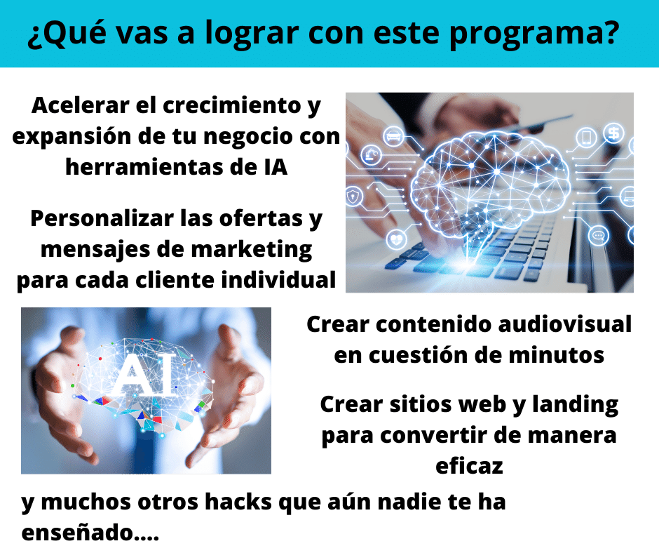 La Inteligencia Artificial (IA) es la herramienta del futuro que te permitirá optimizar tu tiempo y aumentar tus ganancias. Con nuestro programa de IA para emprendedores, aprenderás a utilizar las herramientas de IA más avanzadas y efectivas en tan solo unos pocos minutos al día. Descubre cómo puedes ahorrar tiempo y dinero en la creación de contenido de marketing de alta calidad que destaque en la industria y atraiga a tus clientes ideales.