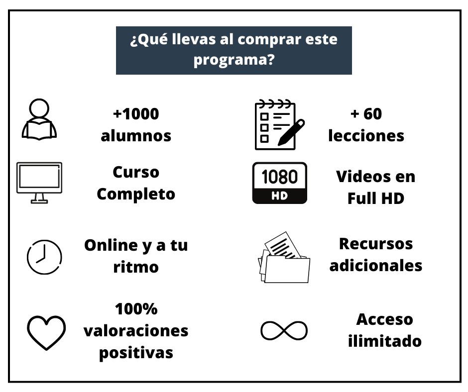 Masterclass con mas de 50 lecciones en formato de video FULL HD y futuras actualizaciones.