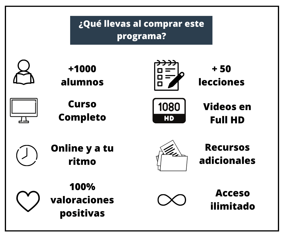 Masterclass con mas de 50 lecciones en formato de video FULL HD y futuras actualizaciones.
